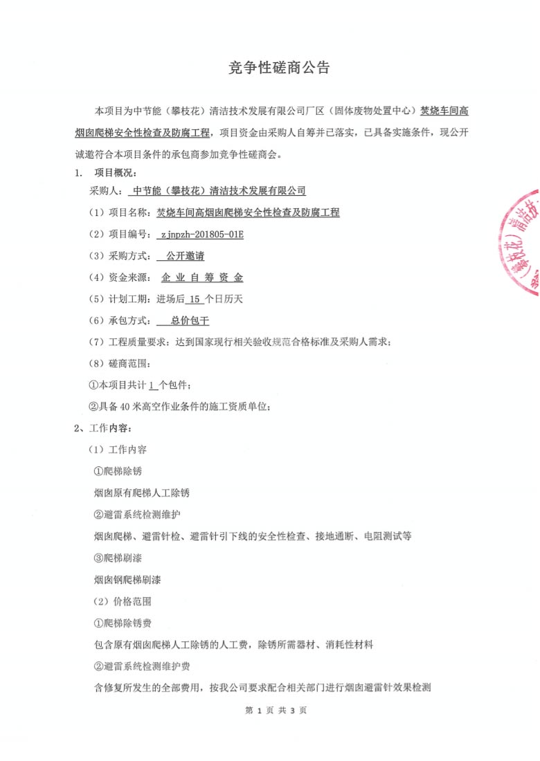焚燒車間高煙囪爬梯安全性檢查及防腐工程競爭性磋商公告